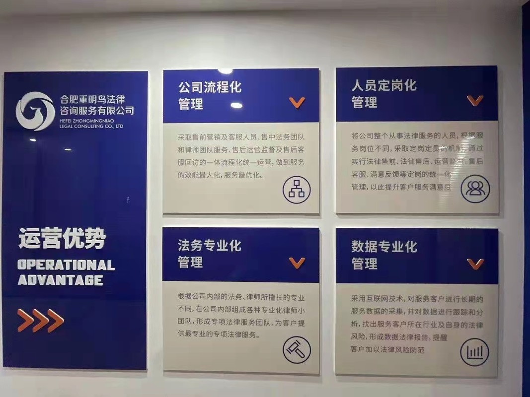 合肥重明鳥法律咨詢服務(wù)有限公司位于合肥市廬陽區(qū)北一環(huán)金龍國際A座24樓,辦公面積近2000㎡,是一家專業(yè)化的法律咨詢公司。團隊化協(xié)作、專業(yè)化分工、定制化服務(wù)是我們的核心優(yōu)勢,團隊致力于為客戶提供最專業(yè)、最高效、最優(yōu)質(zhì)的法律服務(wù)。合肥重明鳥法律咨詢服務(wù)有限公司提供的法律服務(wù)包含法律顧問、合同糾紛、土地拆遷、建筑房產(chǎn)、債權(quán)債務(wù)、婚姻家事、損害賠償、刑事辯護、勞動工傷、知識產(chǎn)權(quán)、公司業(yè)務(wù)等在內(nèi)的20多項專業(yè)領(lǐng)域。合肥重明鳥法律咨詢服務(wù)有限公司法律服務(wù)團隊目前服務(wù)包括生產(chǎn)制造、國內(nèi)外貿(mào)易、科技類、企業(yè)咨詢類、財務(wù)類、建筑類等多行業(yè)、超過千家的安徽境內(nèi)中小型企業(yè)客戶