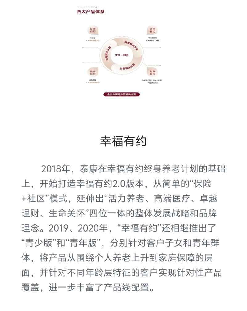 公司介紹泰康保險(xiǎn)集團(tuán)股份有限公司成立于1996年,總部位于北京,至今已發(fā)展成為一家涵蓋保險(xiǎn)、資管、醫(yī)養(yǎng)三大核心業(yè)務(wù)的大型金融保險(xiǎn)服務(wù)集團(tuán)。泰康保險(xiǎn)集團(tuán)旗下?lián)碛刑┛等藟?、泰康資產(chǎn)、泰康養(yǎng)老、泰康健投、泰康在線等子公司。業(yè)務(wù)范圍全面涵蓋人身保險(xiǎn)、資產(chǎn)管理、企業(yè)年金、互聯(lián)網(wǎng)財(cái)險(xiǎn)、醫(yī)療養(yǎng)老、健康管理、商業(yè)不動(dòng)產(chǎn)等多個(gè)領(lǐng)域。截至2018年底,泰康保險(xiǎn)集團(tuán)管理資產(chǎn)規(guī)模超過(guò)14000億元,退休金管理規(guī)模超2500億元,擁有各級(jí)保險(xiǎn)分支機(jī)構(gòu)超4000家、營(yíng)銷員80萬(wàn),累計(jì)服務(wù)個(gè)人客戶2.62億人,服務(wù)企業(yè)客戶超42萬(wàn)家,支付理賠金額450億元,納稅483億元。2018年,泰康位列《財(cái)富》世界500強(qiáng)第489位,中國(guó)壽險(xiǎn)十強(qiáng)第四位,是中國(guó)市場(chǎng)最大的企業(yè)年金投資管理機(jī)構(gòu)之一。泰康保險(xiǎn)集團(tuán)致力于成為全球領(lǐng)先的、面向大健康產(chǎn)業(yè)的金融保險(xiǎn)服務(wù)集團(tuán)。泰康始終堅(jiān)持“專業(yè)化、市場(chǎng)化、規(guī)范化”理念,深耕壽險(xiǎn)產(chǎn)業(yè)鏈,打造“活力養(yǎng)老、高端醫(yī)療、卓越理財(cái)、終極關(guān)懷”四位一體的商業(yè)模式。致力于讓保險(xiǎn)更安心、更便捷、更實(shí)惠,讓人們更健康、更長(zhǎng)壽、更富足,讓泰康成為人們幸福生活的一部分。泰康保險(xiǎn)集團(tuán)積極踐行健康中國(guó)戰(zhàn)略,整合保險(xiǎn)支付與醫(yī)養(yǎng)服務(wù),構(gòu)建大健康產(chǎn)業(yè)生態(tài)體系。作為保險(xiǎn)業(yè)首個(gè)投資養(yǎng)老社區(qū)試點(diǎn)企業(yè),泰康創(chuàng)新醫(yī)養(yǎng)融合模式。已完成全國(guó)重點(diǎn)城市養(yǎng)老社區(qū)及康復(fù)醫(yī)院布局,成為全國(guó)最大的高品質(zhì)連鎖養(yǎng)老服務(wù)集團(tuán)。泰康推進(jìn)價(jià)值醫(yī)療創(chuàng)新,建設(shè)國(guó)際水平的現(xiàn)代醫(yī)療體系,在全國(guó)著力打造多個(gè)醫(yī)教研一體化醫(yī)學(xué)中心,構(gòu)建口腔等專科醫(yī)療體系,“醫(yī)養(yǎng)康寧”實(shí)體機(jī)構(gòu)運(yùn)營(yíng)數(shù)量達(dá)250余家。泰康還廣泛投資于醫(yī)療、制藥、醫(yī)療器械、人工智能等大健康企業(yè),探索健康產(chǎn)業(yè)生態(tài)布局。秉承“服務(wù)公眾、回饋社會(huì)”理念,泰康積極履行企業(yè)社會(huì)責(zé)任。在教育學(xué)術(shù)領(lǐng)域,已經(jīng)形成從小學(xué)、中學(xué)、大學(xué)到中國(guó)經(jīng)濟(jì)理論創(chuàng)新獎(jiǎng)的全面教育捐贈(zèng)體系;在文化藝術(shù)領(lǐng)域,通過(guò)非營(yíng)利藝術(shù)機(jī)構(gòu)“泰康空間”長(zhǎng)期贊助和支持中國(guó)當(dāng)代藝術(shù)發(fā)展與研究:在養(yǎng)老大健康領(lǐng)域,發(fā)起成立泰康溢彩公益基金會(huì),資助實(shí)施以“溢彩公益計(jì)劃”為主的助老、扶貧、助醫(yī)項(xiàng)目,促進(jìn)民生福祉。