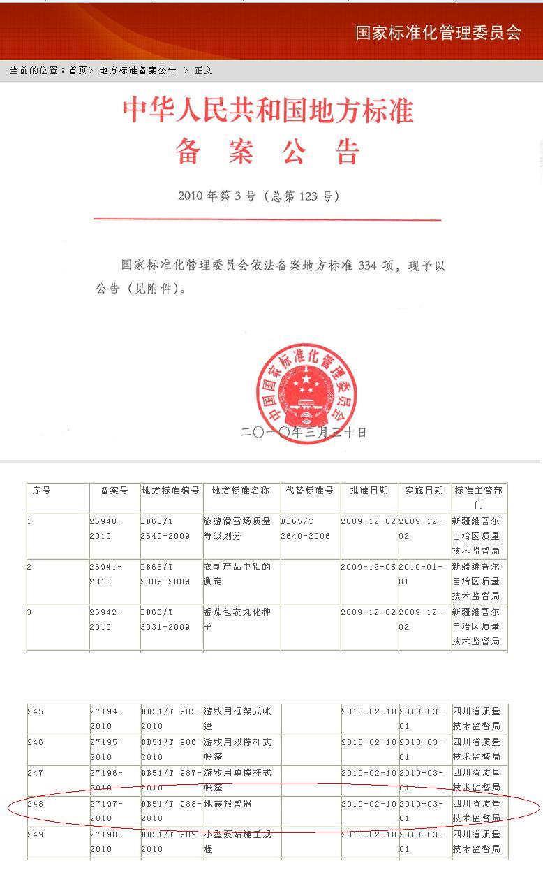 《地震報(bào)警器》四川省地方標(biāo)準(zhǔn)備案公告正式發(fā)布