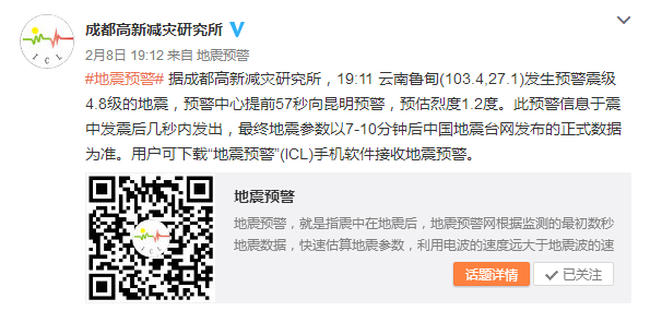 2月8日19時(shí)11分,云南魯?shù)榘l(fā)生4.9級(jí)地震,由昭通市防震減災(zāi)局和成都高新減災(zāi)研究所(減災(zāi)所)聯(lián)合建設(shè)的地震預(yù)警系統(tǒng)成功預(yù)警此次地震,給昆明市提前65秒預(yù)警,給昭通市提前6秒預(yù)警。初步統(tǒng)計(jì)表明,云南省昭通市、四川省涼山市等2個(gè)市的4所學(xué)校提前0秒-30秒發(fā)出預(yù)警。還通過(guò)包括四川科技等近20個(gè)政務(wù)微博發(fā)布了地震預(yù)警信息,還為國(guó)家減災(zāi)中心等提前預(yù)警了該地震。