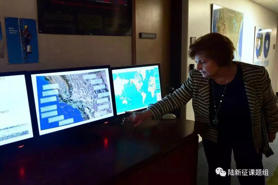 加州理工學(xué)院地震實驗室的 Margaret Vinci 正指著一排監(jiān)測地震活動的地震預(yù)警顯示屏