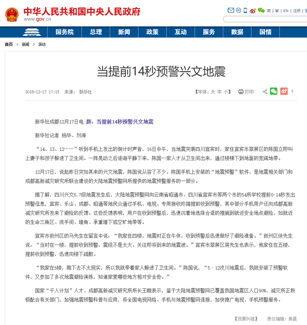 新華社成都12月17日電 題:當(dāng)提前14秒預(yù)警興文地震