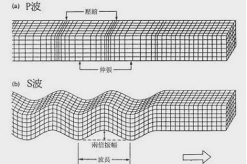 地震波在地震發(fā)生后會(huì)主要產(chǎn)生兩種類(lèi)型的波——縱波(p波)和橫波(s波)。縱波的速度快但破壞性小,橫波的速度慢但破壞力大。