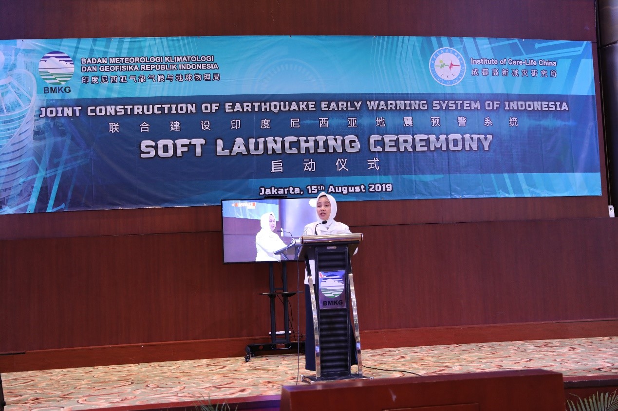 維科麗塔·卡納瓦蒂博士在致辭中說:“我要向中國政府和中國成都高新減災(zāi)研究所表示衷心的感謝和高度贊賞,感謝他們?yōu)榧涌煊《饶嵛鱽喌卣痤A(yù)警系統(tǒng)的建設(shè)和發(fā)展作出的貢獻。我非常希望貴方辛勤的付出能夠產(chǎn)生重大影響,在地震風(fēng)險中挽救人員、保護重要基礎(chǔ)設(shè)施。” 她用印尼語進行了地震預(yù)警科普,對地震預(yù)警和地震預(yù)報的區(qū)別進行了介紹。表示非常高興能夠和減災(zāi)所聯(lián)合建設(shè)印尼地震預(yù)警系統(tǒng),為社會提供地震預(yù)警服務(wù),這對印尼民眾具有重大意義。她表示,印尼地震預(yù)警系統(tǒng)建成后,可以在地震發(fā)生后的幾秒內(nèi)就發(fā)出地震預(yù)警信息,描述地震烈度和等級,為受影響區(qū)域提供期望獲得的提前警告,以便人員和自動化系統(tǒng)可以采取行動預(yù)防潛在的損害。她表示,由于印度尼西亞的許多地震事件非常獨特,希望通過雙方的合作,進一步促進對地震機制的研究,進一步豐富地震預(yù)警應(yīng)用場景,進一步完善地震預(yù)警應(yīng)用策略,更好地提升地震預(yù)警技術(shù)的減災(zāi)效果。她還表示將與印尼相關(guān)部門一起促進地震預(yù)警服務(wù),保障印尼民眾的地震安全,并融合海嘯預(yù)警服務(wù)社會。