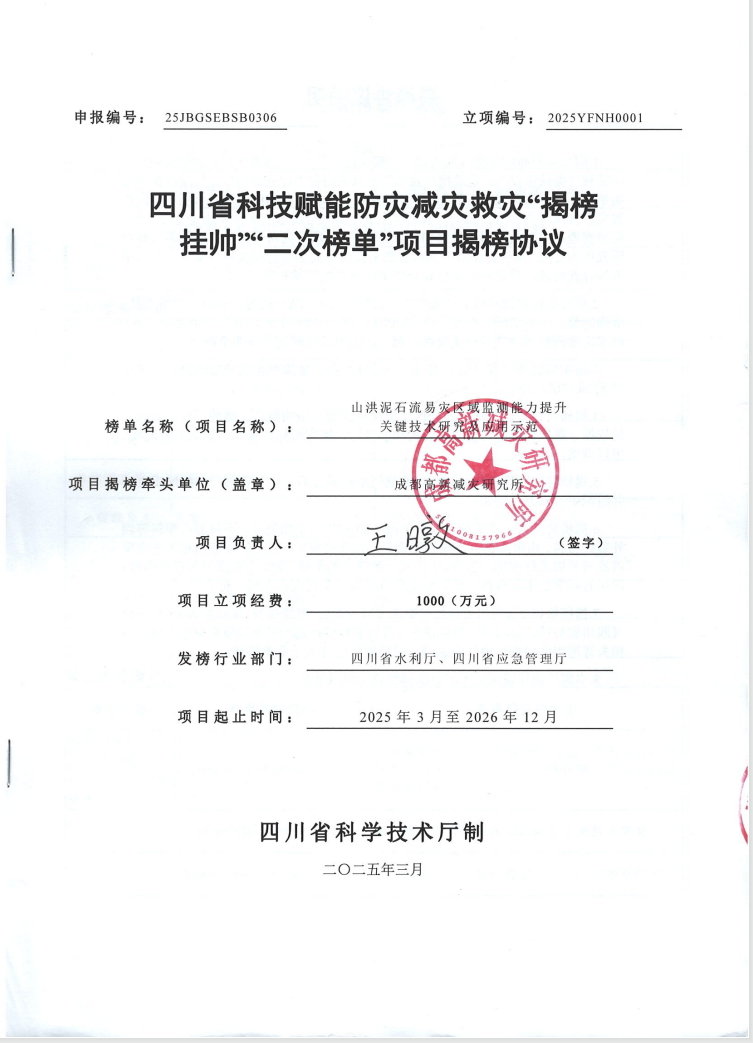 2025年1月,減災(zāi)所牽頭中榜一項(xiàng)四川省政府“揭榜掛帥”災(zāi)害預(yù)警項(xiàng)目:山洪泥石流易災(zāi)區(qū)域監(jiān)測(cè)能力提升 關(guān)鍵技術(shù)研究及應(yīng)用示范,此項(xiàng)目由北京大學(xué)、國家氣象中心、南京大學(xué)、電子科技大學(xué)、中科院山地所、水利部、成都山地災(zāi)害與環(huán)境研究所、國網(wǎng)四川雅安電力(集團(tuán))股份有限公司、成都高新減災(zāi)智匯科技有限責(zé)任公司 等單位共同承擔(dān)。