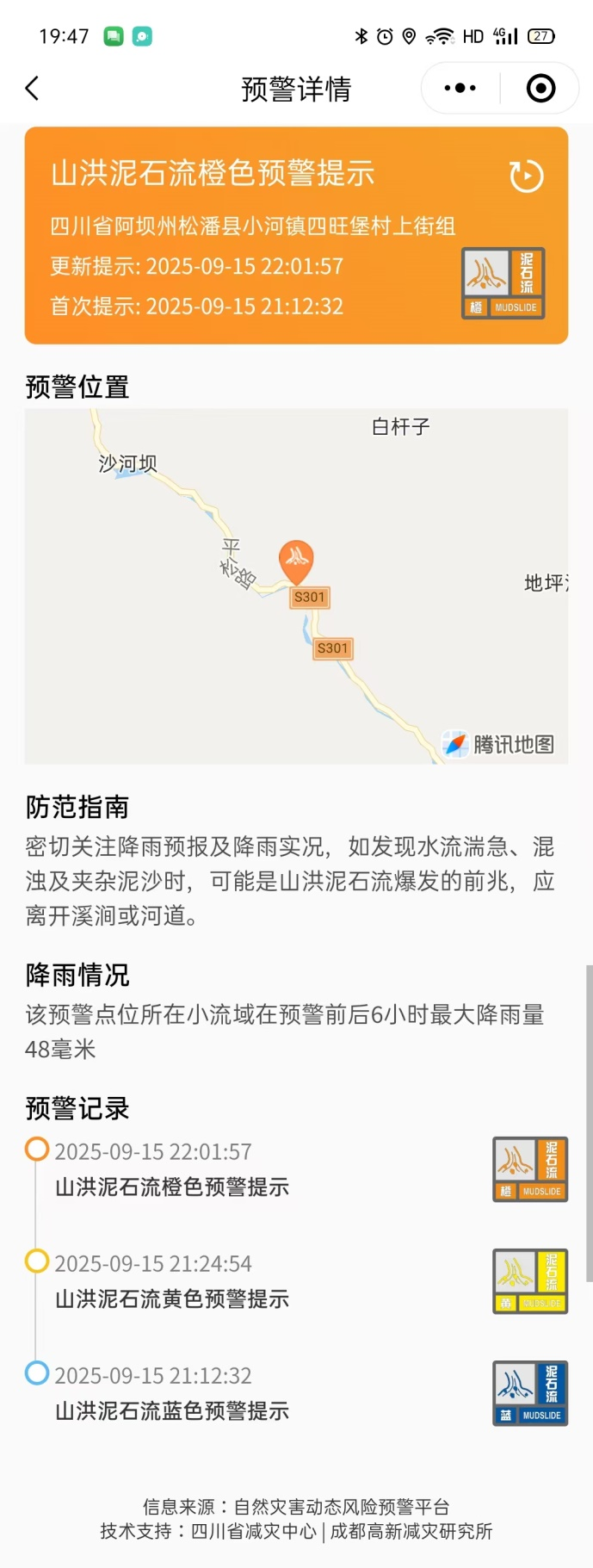 91521時(shí)12分,大陸多災(zāi)種預(yù)警網(wǎng)對(duì)四川省阿壩州松潘縣小河鎮(zhèn)四旺堡村上街組的泥石流藍(lán)色預(yù)警,22時(shí)01分該預(yù)警信息升級(jí)為泥石流橙色預(yù)警。